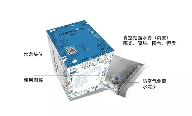 BIB盒中袋包裝礦泉水有益環境、方便消費者,因為“ BIB盒中袋包裝的產品無需舉起傾倒,更方便老人兒童飲用。”而方形包裝使盒子很容易在操作臺或冰箱擺放,液體可從設計在側面的水龍頭里流出來。方形包裝相比傳統的桶裝及PET瓶裝也更易倉儲及運輸,降低了倉儲及運輸成本。